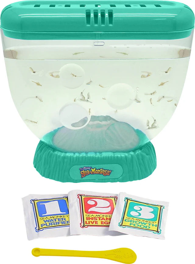 Sea-Monkeys, tiny brine shrimp invented in the 1950s, remain in suspended animation until you activate them using the provided kit in their aquarium.